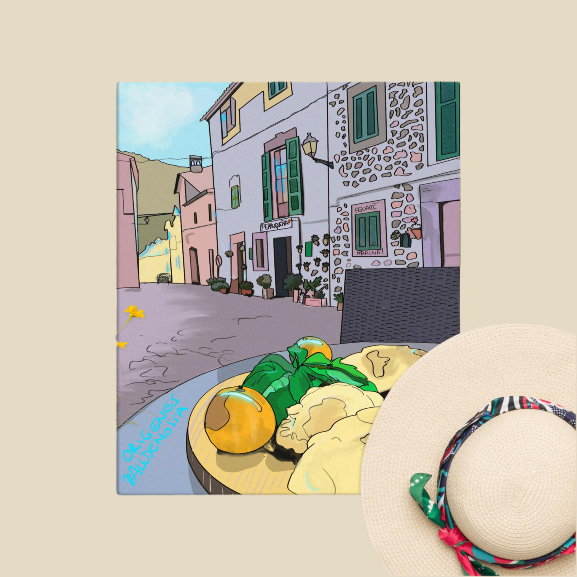 Ilustración de Valldemossa desde el bar Origenes en calle la Rosa, calle muy querida por su pueblo. Este lienzo dará personalidad a cualquier espacio donde se coloque. El lienzo de polialgodón se ha estirado a mano y cuenta con un acabado mate.